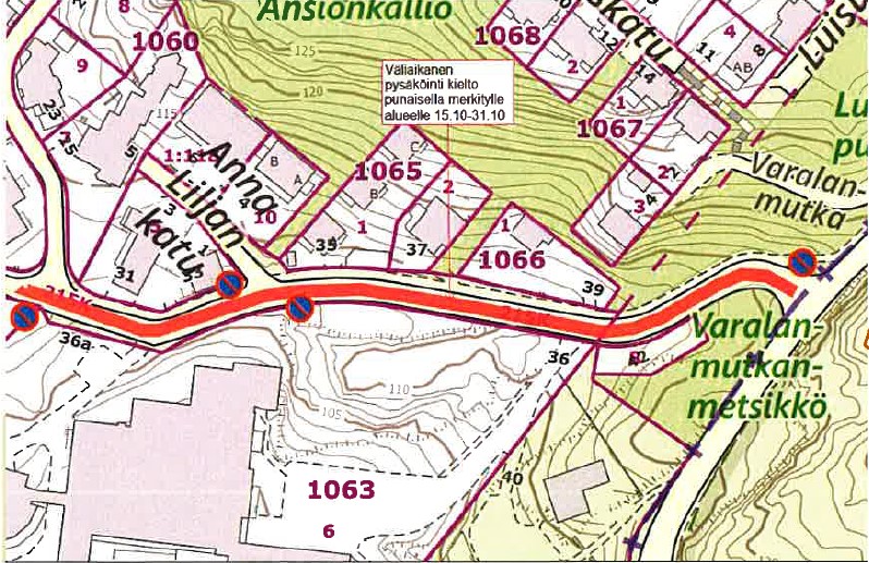 Saneeraustöiden aikana pysäköinti on kielletty merkityllä alueella Varalankadulla 24/7.