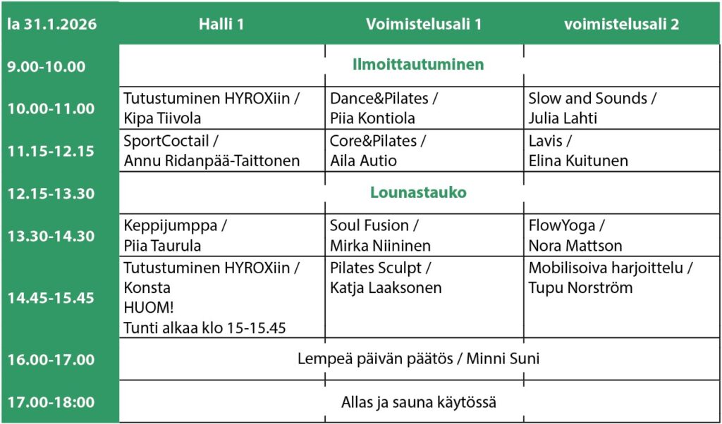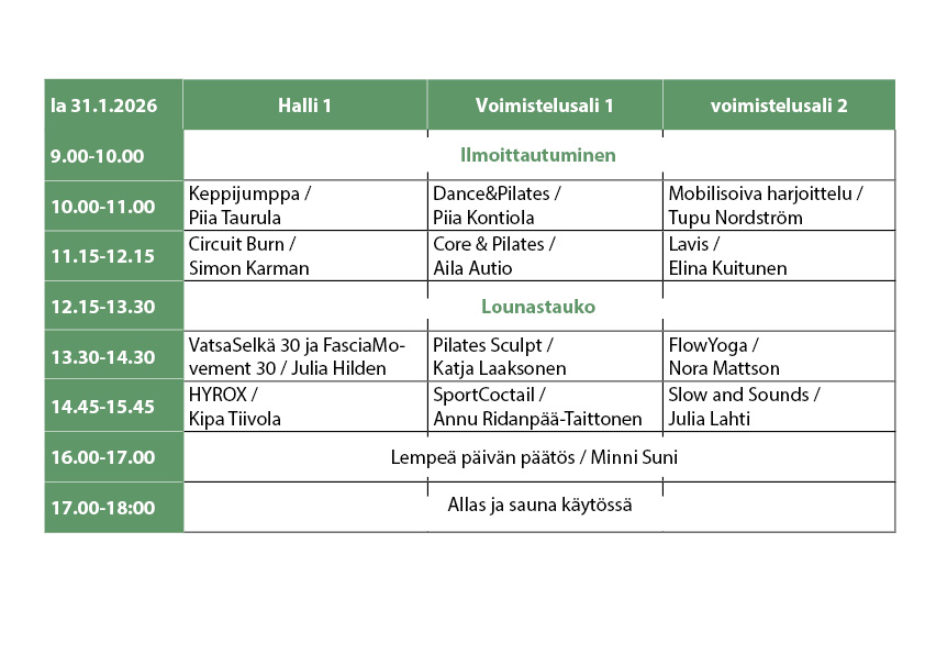 Tämä päivä on omistettu inspiraatiolle ja luovuudelle. Luvassa on antoisia ja erilaisia ryhmäliikuntatunteja, iloa sekä yhdessäoloa.